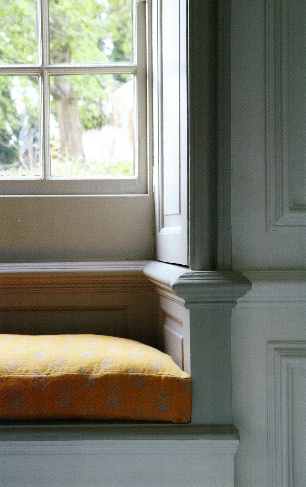 Above: A window seat detail from Farrow and Ball's new book, "Living With Colour". Not a place you'd want to read, but excellent for looking out the window. The wood detail is well crafted.