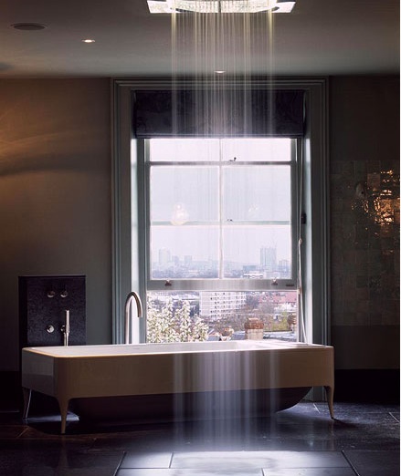 Above: This room carries a sense of adventure with the floor level window opening and the shower seeming to rain with no boundaries. It's from a collaborative project in Hampstead Heath, by architects Stiff + Trevillion and designer Retrovious.