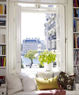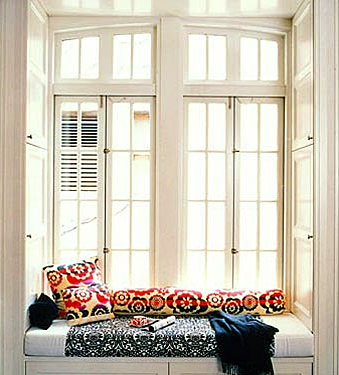 As everyone who knows me is aware, I am obsessed with window seats. Ideally they should be perfect places to daydream and read. The only problem is good ones are rare...they should be deep enough for comfort, with a thick cushion and supporting pillows all around. Too often they are narrow and there's no place to lean back. I can attest to the first one below being truly excellent as I've been able to spend time relaxing on it very happily.
