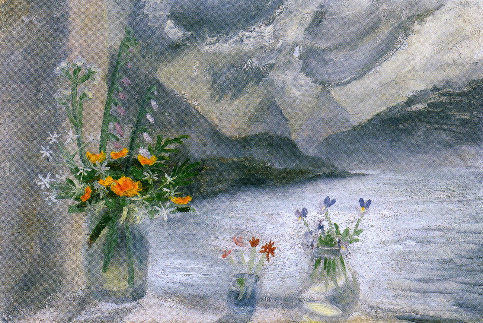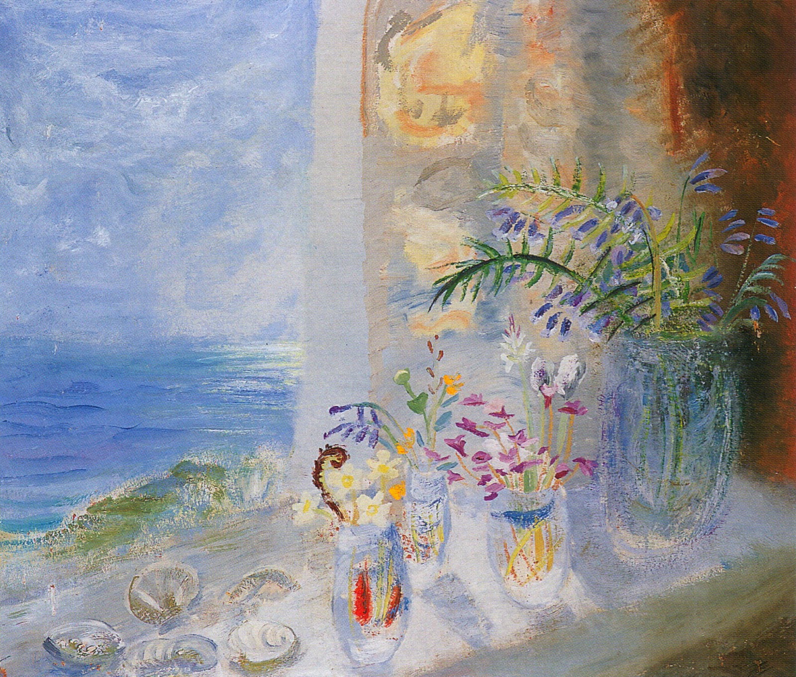 Above: Winifred Nicholson (1893-1981) "View from Gavin Maxwell's" 1958. The two pieces by Nicholson were painted in Sandaig, Scotland. Flowers on a sill with the wild ocean or rocks in the background was a favorite theme. She was both the wife of a well known artist...Ben Nicholson, and the daughter-in -law as well, of William Nicholson. In the late 1940s and throughout the 1950s she traveled to remote places in Scotland, such as the Isle of Skye, the Isle of Wight, South Ouist, Canna, Sandaig, and Eigg, to paint. She found the landscape, the quality of light, and the constantly changing weather conditions there to be the right environment.