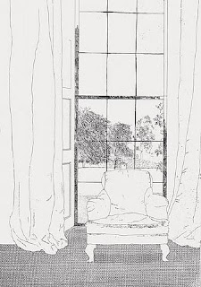 Above: In another house designed by Roy McMakin, the window at the far end is used as a piece of art, almost a painting hung on the wall. It is very different from the floor to ceiling glass windows at the left, and intended to be something singular, a focal point. It's configuration is the same as in the Fairfield Porter painting above.